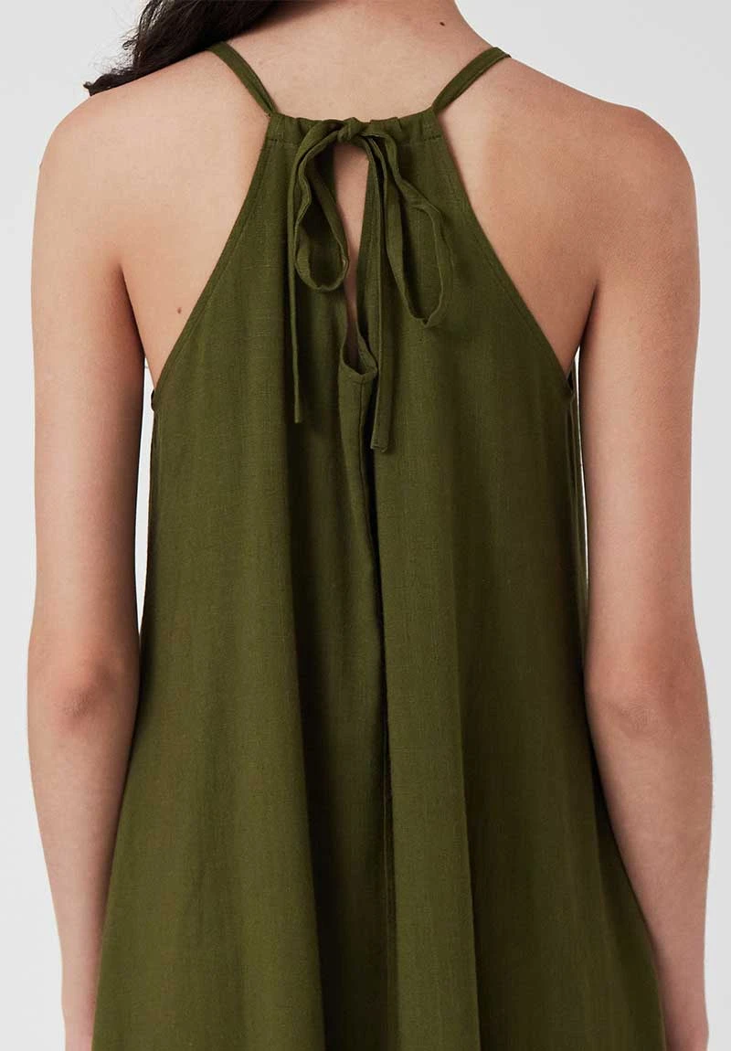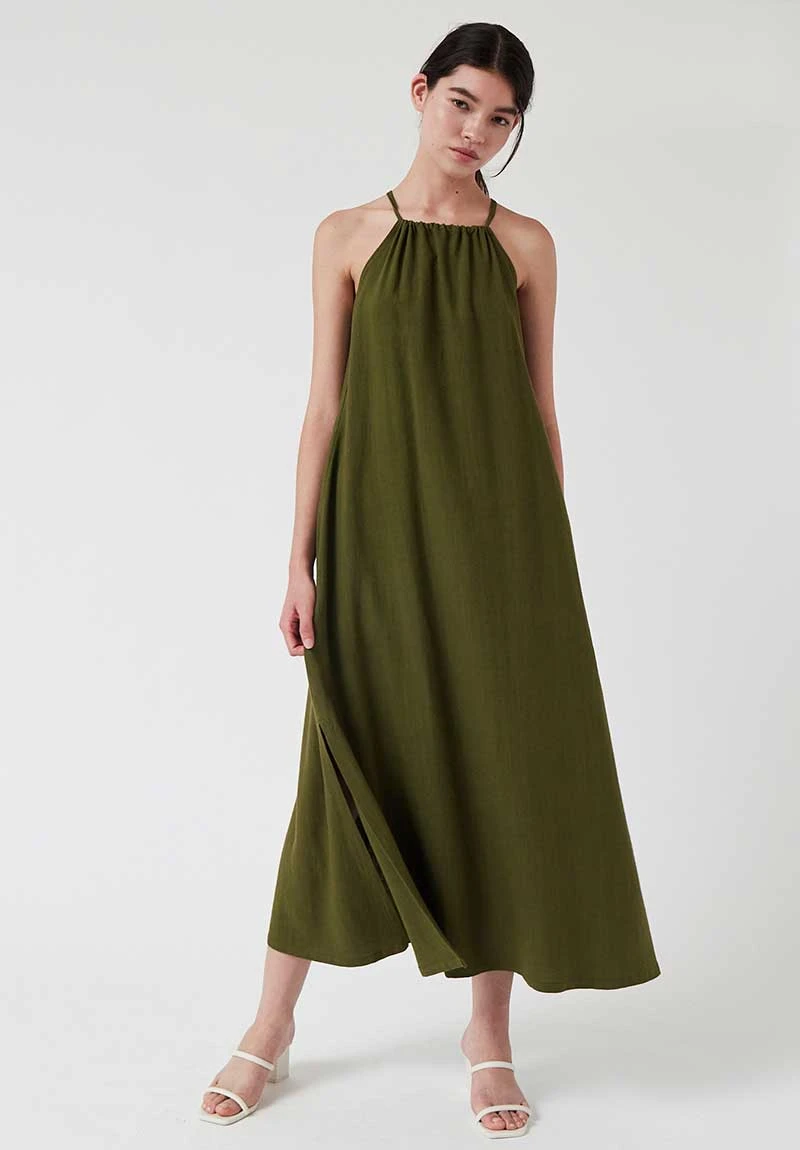 On adore cette robe fines bretelles ajustables qui laisse dévoiler vos jolies épaules. Son tissu en Viscose Ecovero et lin est très confortable et thermorégulateur. Sa couleur kaki s’accorde avec quasiment tout.