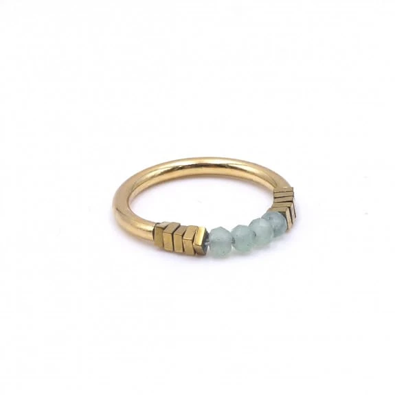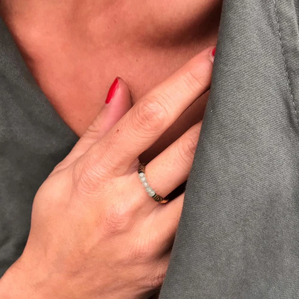 Une bague en pierre d’aventurine aux multiples reflets. Elle peut se porter seule ou en accumulation avec d’autres bagues.