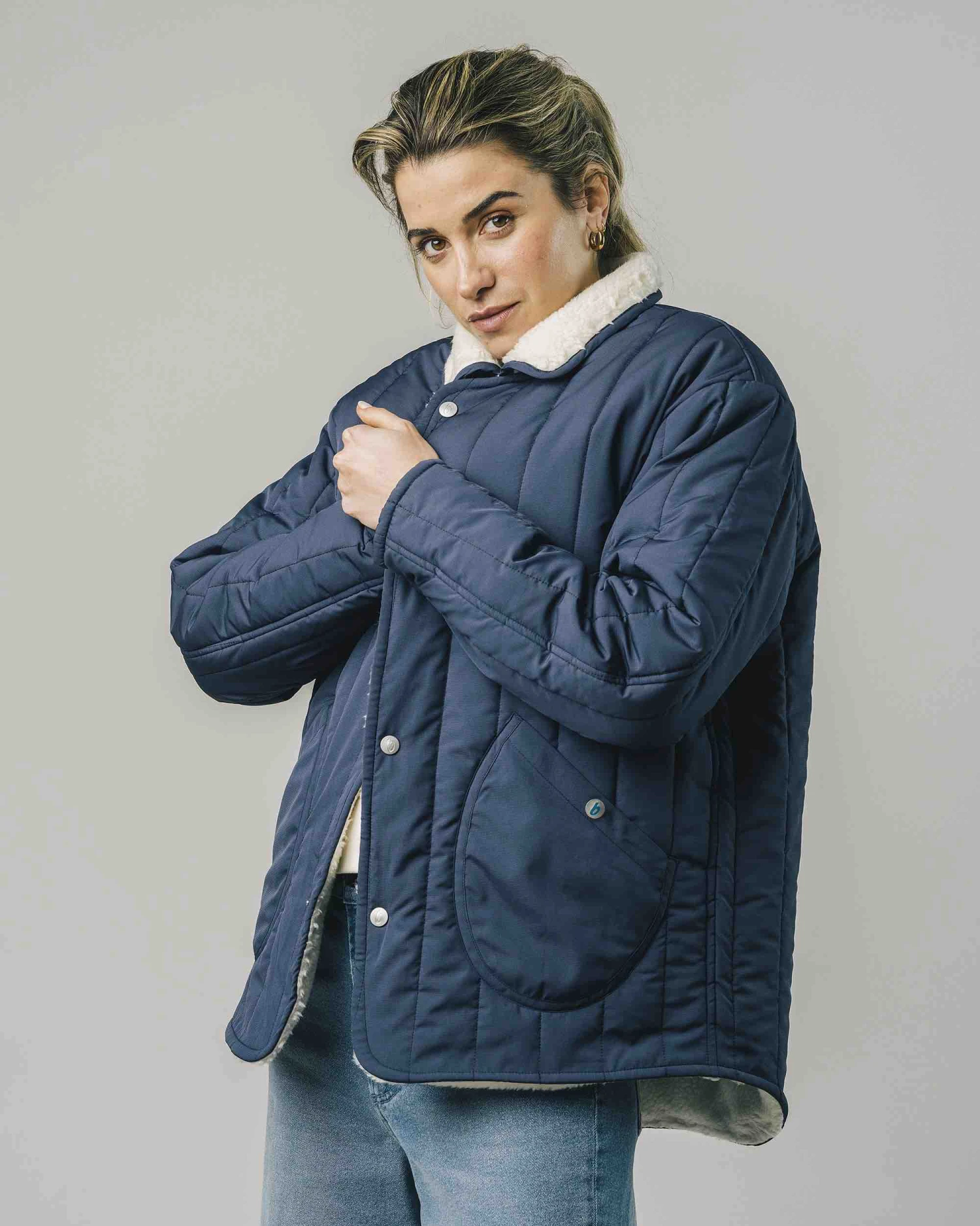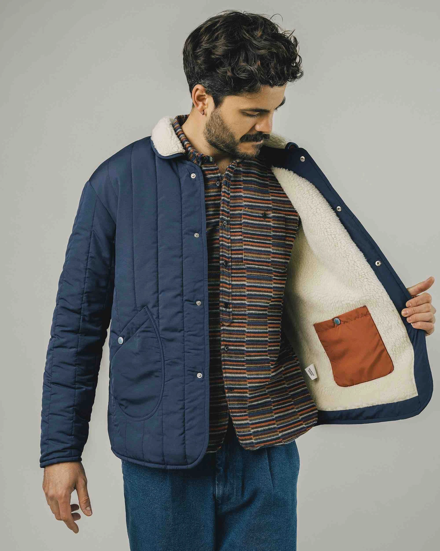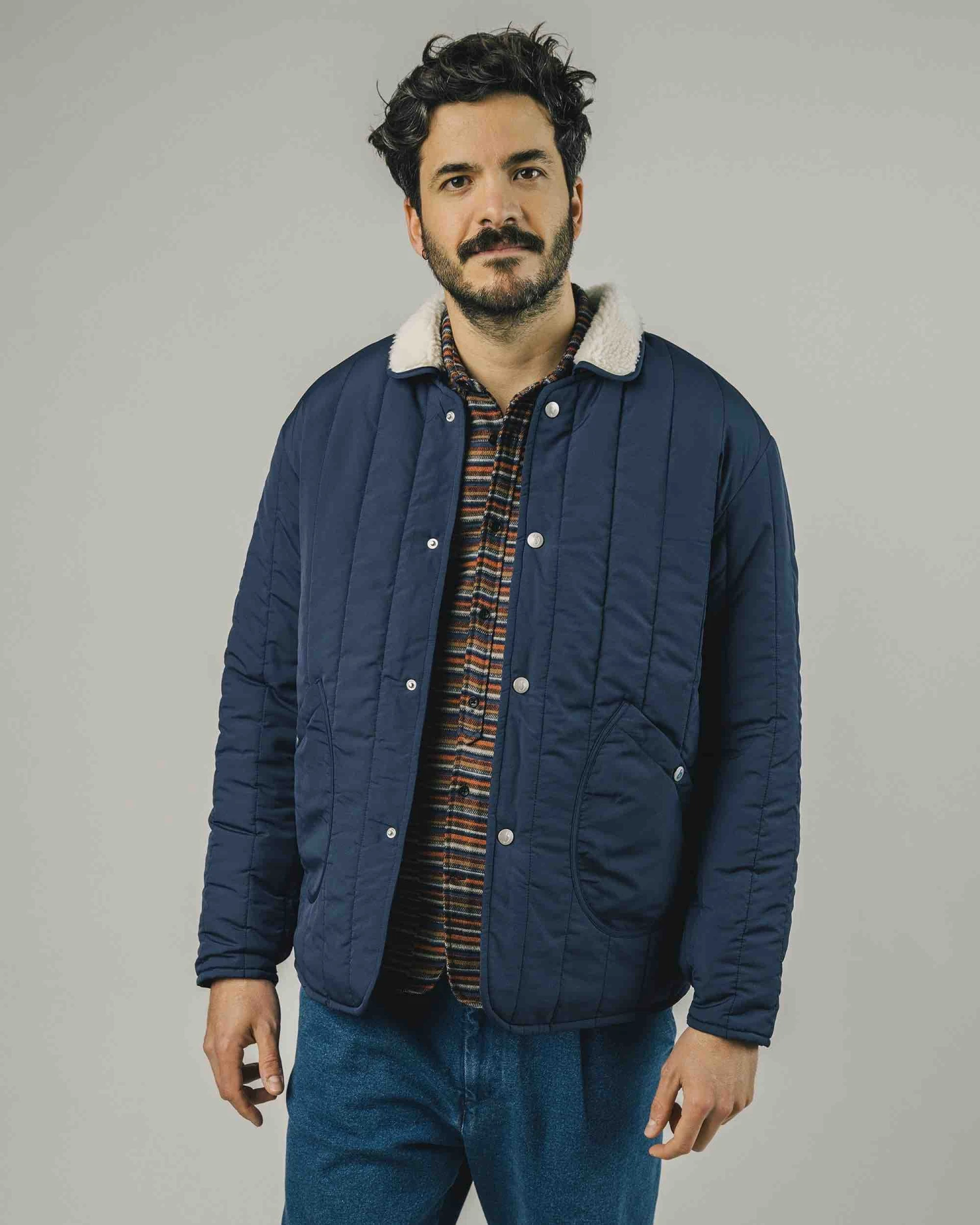Le manteau se compose à l’extérieur de 70% Polyester Recyclé et 30% Seaqual (tissu fabriqué à partir de déchets repécher en mer).