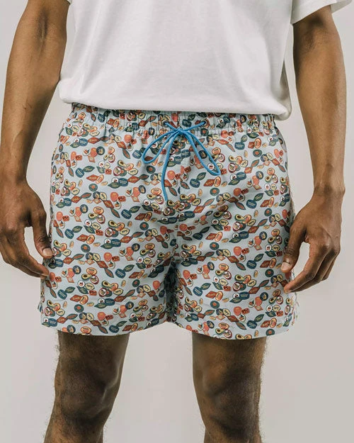 Maillot de bain homme avec motif stickers sur fond bleu ciel.