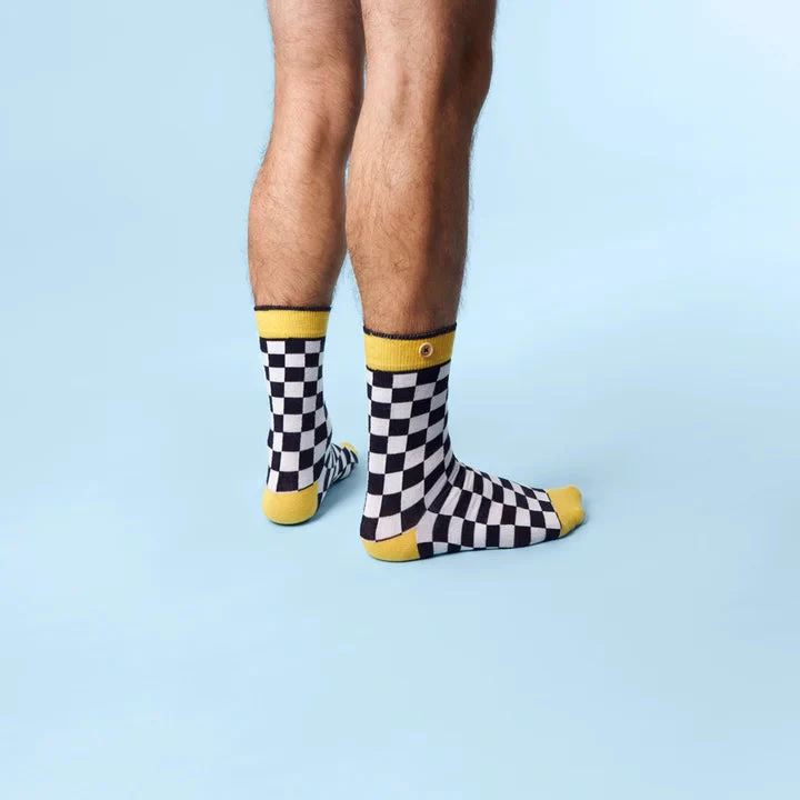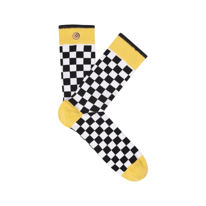 Imprimé carreaux blanc et noir avec bande jaune sur le haut de la chaussette.