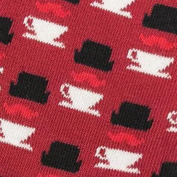 Imprimé tasses, moustaches et chapeaux sur fond rouge.