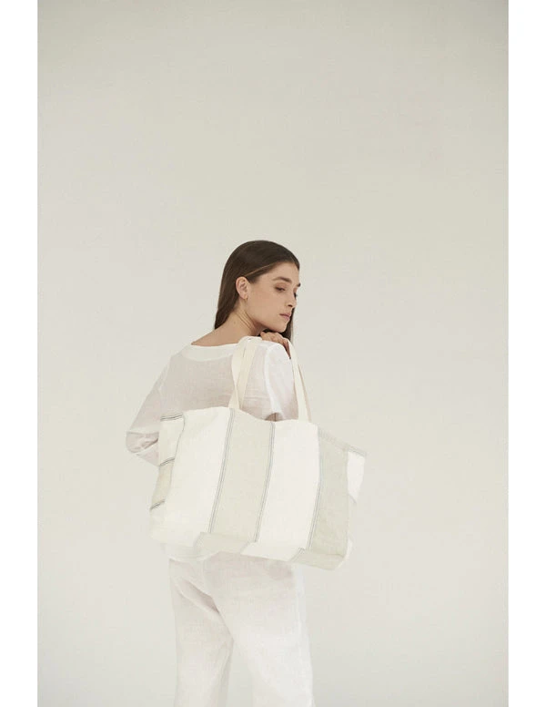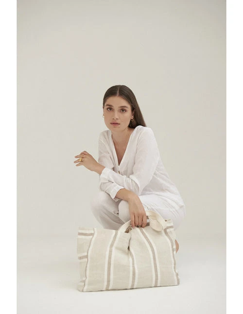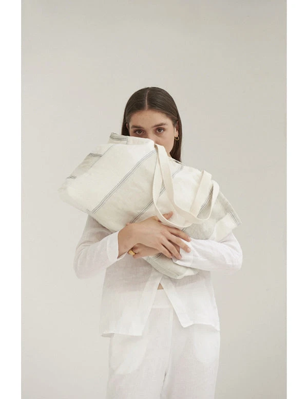 Ce cabas en lin est une création de Mus & Bombon : marque espagnole aux collections durables et épurées. Il a une forme rectangulaire, une grande contenance et possède deux poignées courtes et deux longues. Le lin lui confère solidité et résistance avec en plus un support dur pour maintenir la structure. Il sera très pratique pour aller à la plage, partir en week-end ou pour transporter les affaires de bébé.