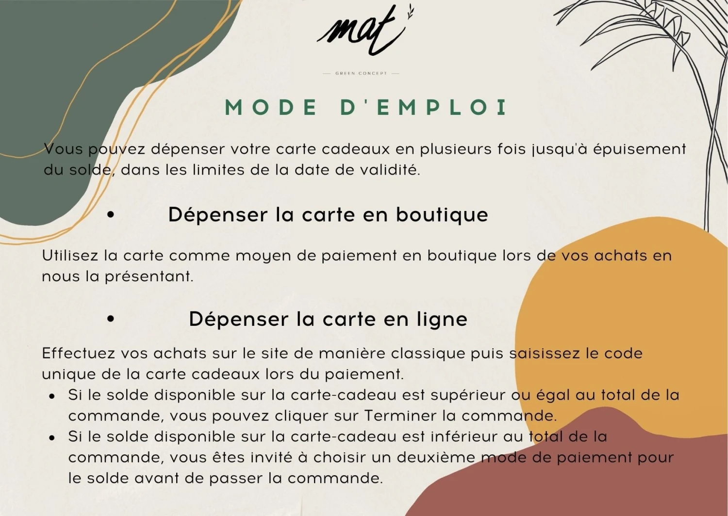 Après votre commande, vous recevez automatiquement le code de votre carte par mail. Puis nous vous envoyons la jolie carte cadeau MAT par mail avec la date de validité et le montant à dépenser. Vous pouvez l’imprimer pour l’offrir en main propre !
