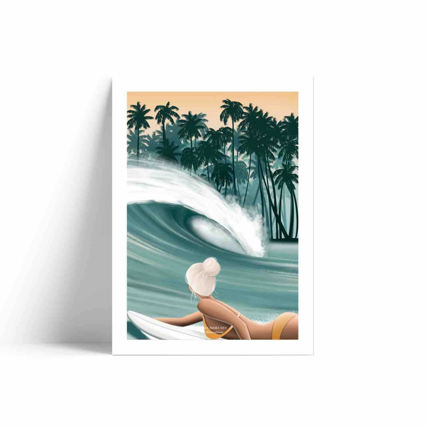 Juliette s’inspire de ses années passées en Amérique Latine pour dessiner l’art de vivre de ces Rideuses telles des Amazones de l’océan ! Elle imagine et imprime elle-même ses illustrations colorées et océanique dans les Landes où elle vit.