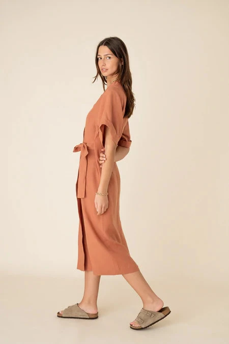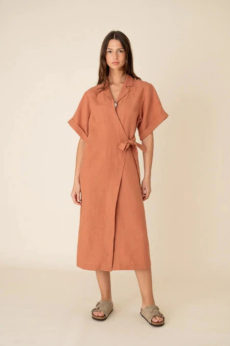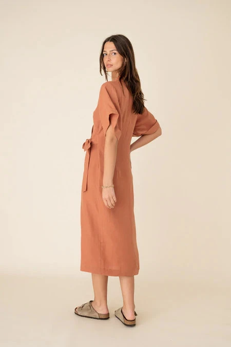 La robe cache coeur longue est fabriquée en Roumanie. Le lin a été cultivé en Europe et tissé en Belgique.