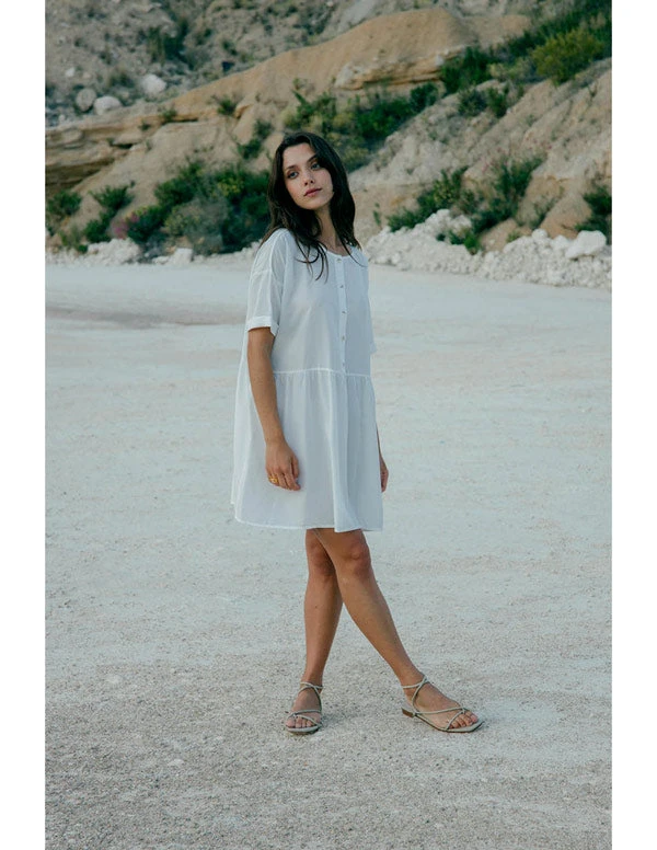 Cette robe est une création de Mus & Bombon : marque espagnole aux collections durables et épurées. Elle est en lyocell ce qui la rend fluide et confortable. Elle a trois jolis boutons pour pouvoir ouvrir l’encolure ou non. Elle a un joli plissage au niveau de la taille qui lui apporte du mouvement et des ourlets en bas des manches. A porter en robe ou bien en tunique avec un pantalon !