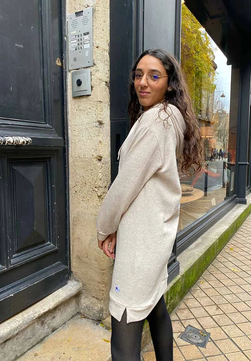 La robe sweat capuche oversize est fabriquée au Portugal.