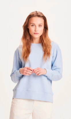 Le sweat bleu ciel se compose à 100% de coton biologique certifié GOTS grade 1.