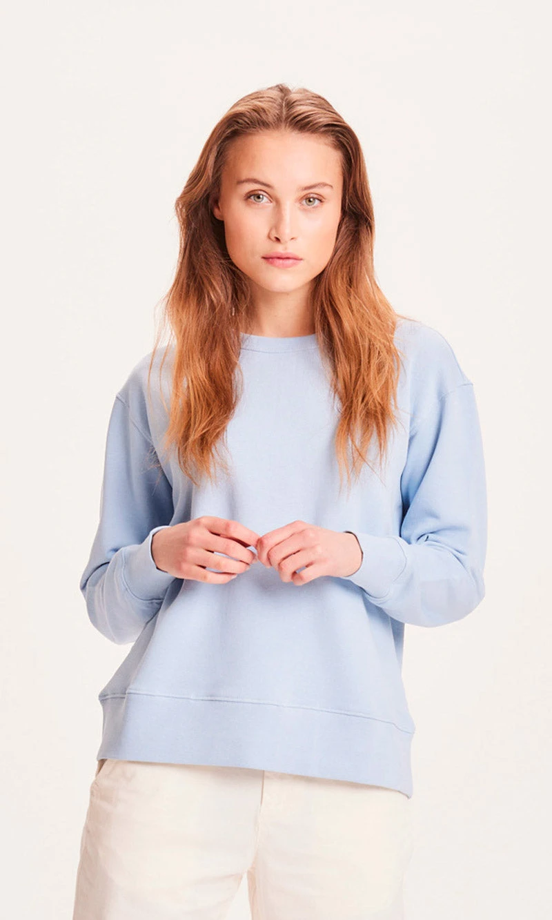 Ce sweat est une création de Knowledge Cotton Apparel : marque référence du vêtement éthique. Ce sweat est le basique indispensable à toute garde-robe. Il est confortable et se porte loose. Il comporte des côtes aux manches et à l’ourlet. Ce joli bleu pastel donne une note printanière à votre tenue.