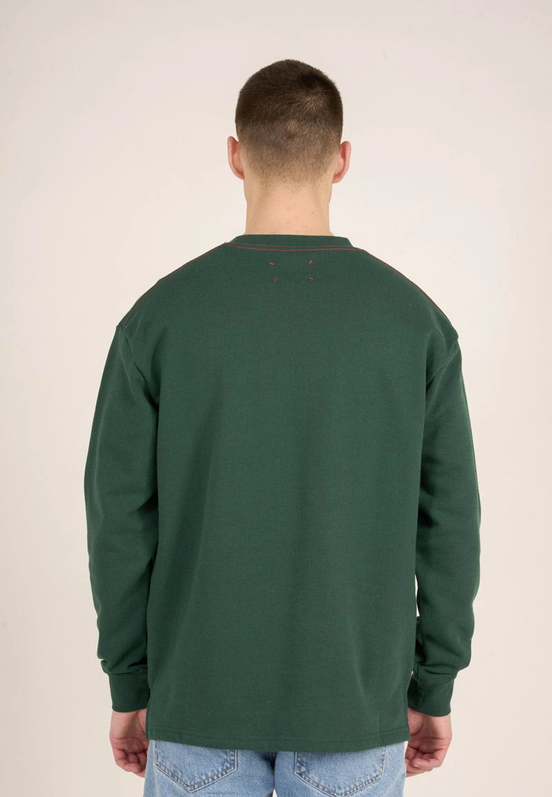 Ce sweat kaki pour homme se compose à 50% de coton bio recyclé et 50% de polyester recyclé.