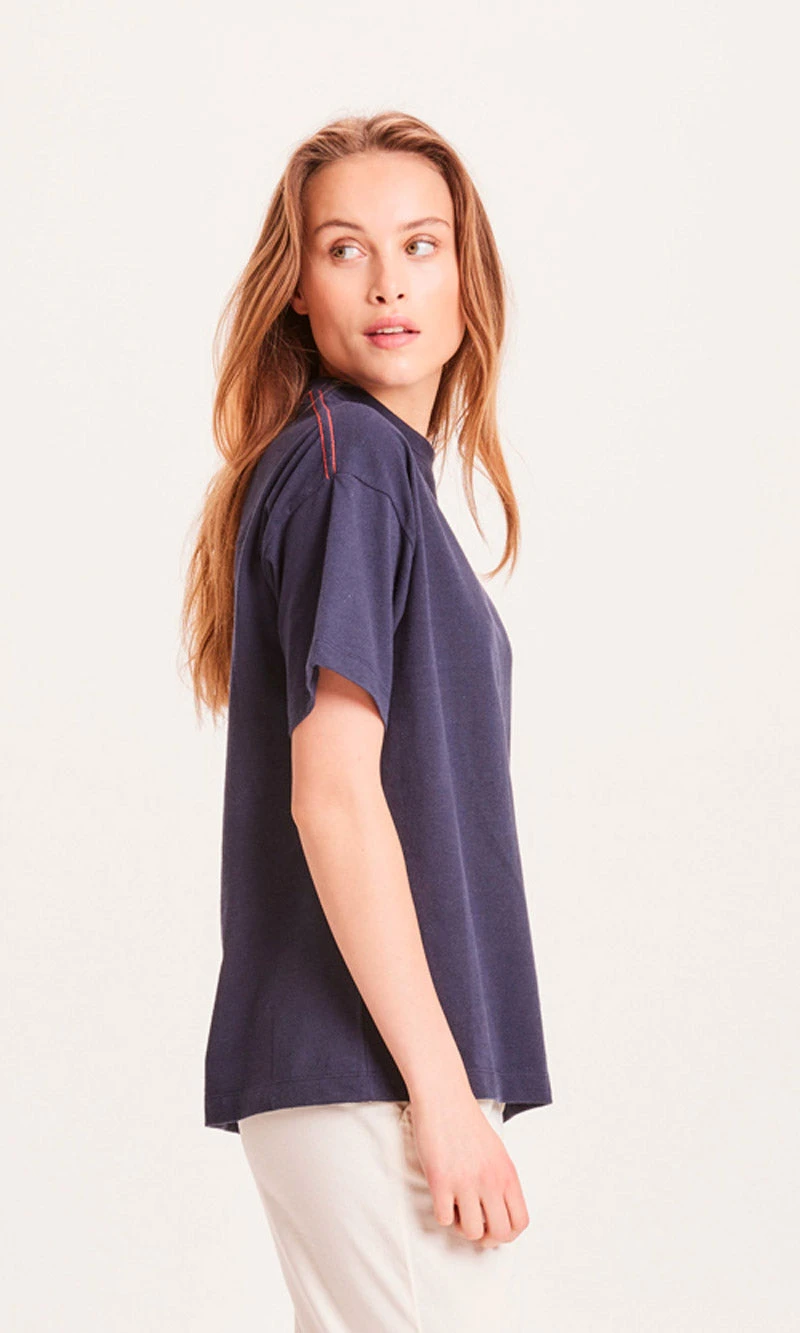 Vous pourrez porter fièrement un t-shirt qui n’a généré aucun nouveaux déchets. Le coton et le polyester ont tous les deux été recyclés ! Sa couleur bleu marine est très facile à porter, vous pourrez donc l’intégrer très facilement à votre garde-robe. On aime aussi ses jolis détails qui le rendent unique : les surpiqures rouges et le patch rouge sur le devant.